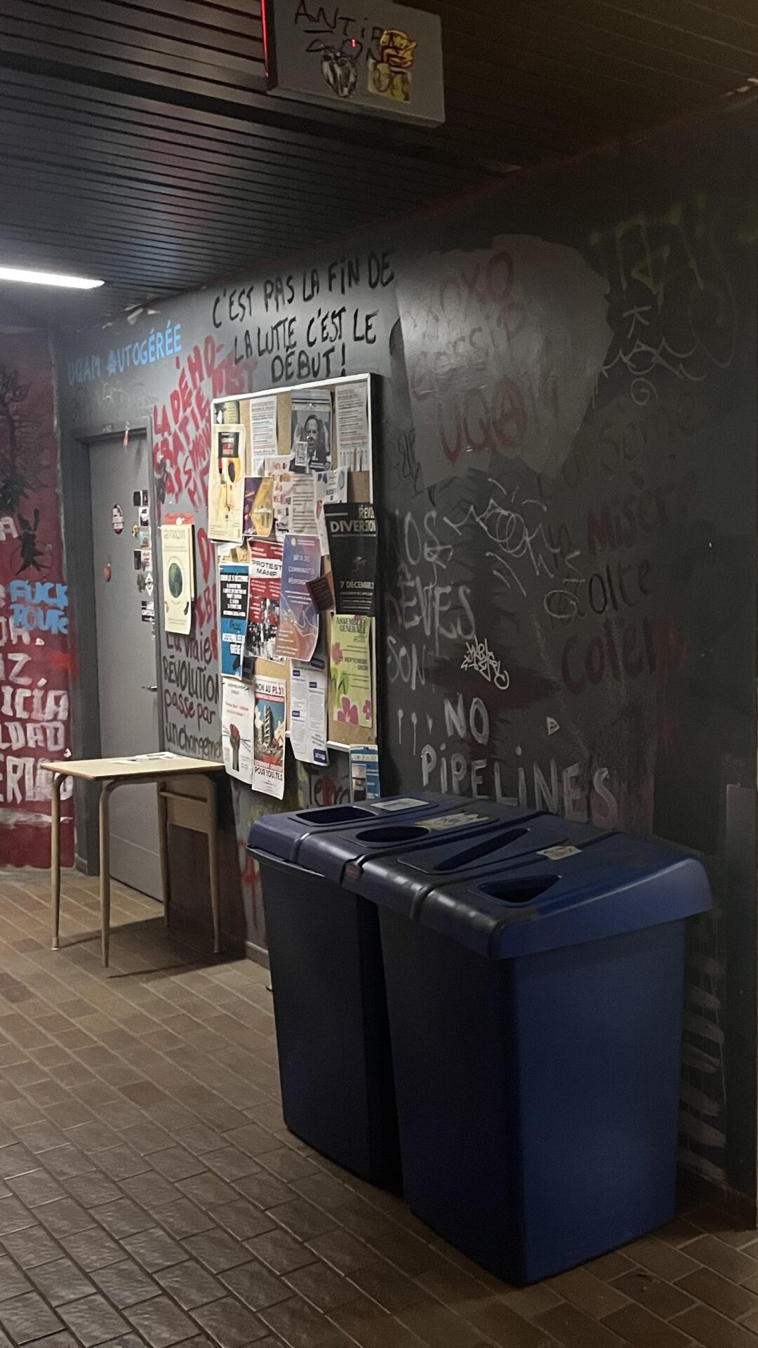 Le 30 novembre, la veille de la parution du dossier, la porte du local de l’Association des étudiants et étudiantes en droit (AED) a été forcée et couverte d’autocollants. Une autre enquête suit son cours au sujet du bris du mobilier de l’UQAM.
