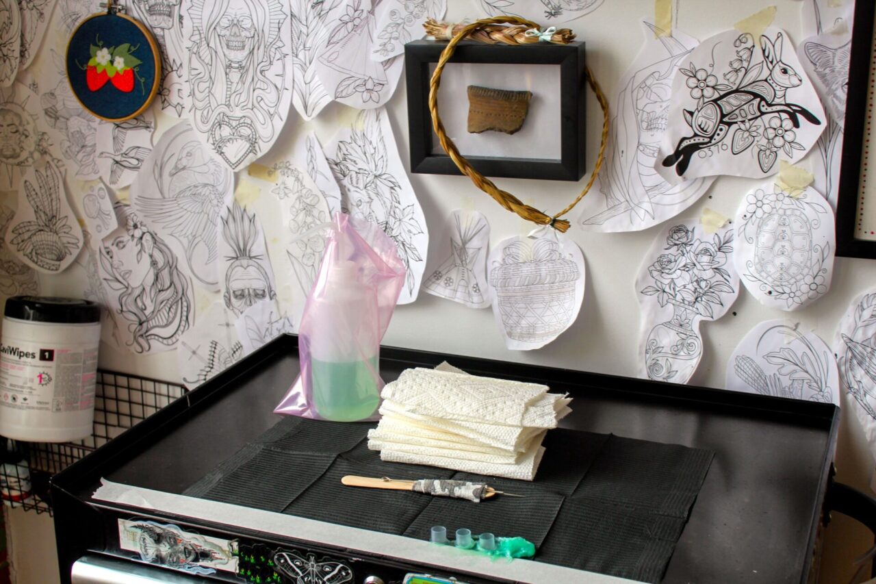 Dans son studio montréalais, l’artiste wendate Terry Dactel souhaite rebâtir la culture de sa communauté en réinterprétant, par le tatouage, des motifs traditionnels portant un symbolisme adapté aux réalités modernes. Elle est l’une des seules tatoueuses à redonner vie aux motifs traditionnels de sa nation.