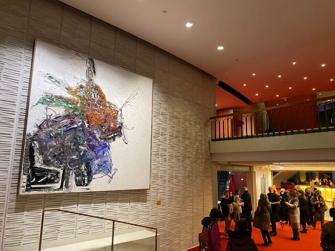 Même avant d’entrer dans la salle, on peut déjà se mettre dans l’ambiance en admirant La Bolduc de Riopelle. La peinture est exposée en permanence dans le foyer de la salle Wilfrid-Pelletier.